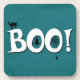 Boo! text design for Halloween with cat, spider, owl and spider net decoration on grunge blue background.