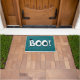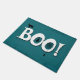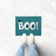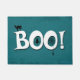 Boo! text design for Halloween with cat, spider, owl and spider net decoration on grunge blue background.