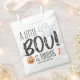 Halloween theme favour bags for October birthdays feature "A Little Boo Is Turning...." typography with a cute watercolor ghost and jack o'lantern and handwriting script accents. The grey and orange colours are perfect for a girl or boy. Art by KL Stock.