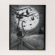 A cute, spooky boo kitty who lives in a black and white world stands on a fence post against an ominous backdrop of birds and a giant harvest moon. From the October 2020 ink art challenge sketchbook of Amanda Diehl, Paxdomino Designs.