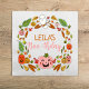Adorable Halloween themed October birthday party napkins featuring a sweet, not scary, wreath of jack o lanterns, autumn leaves, and a cute ghost with room in the centre for your child's name! Bring your celebration together with these little details to make your boo-thday event one of a kind!