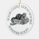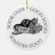 Classic black and white graphic features a cat curled up on a stack of books. Text reads Book Club - Good Books - Good Friends. Ornament is perfect for the holidays. Hang one on a tree, in the office, library, reading room and your favourite reading spot. Use as a gift, prize or award.