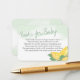 Book Request enclosure cards decorated with citrus lemon wedges and greenery in watercolor - perfect for spring, summer, mediterranean, limoncello and mimosa themes. Books for Baby is hand lettered in casual handwritten typography and the poem is editable. The back of the card is has a mint green watercolor wash and, is personalised with your name, occasion and date.