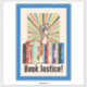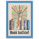 Protest banning books with this image that features a shelf of banned books, a protesting raised fist, a burst of colour rays and the words "Book Justice" in a retro font. Accented by a border of rich blue. Looks great!