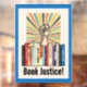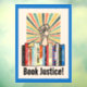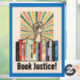 Protest banning books with this image that features a shelf of banned books, a protesting raised fist, a burst of colour rays and the words "Book Justice" in a retro font. Accented by a border of rich blue. Looks great!