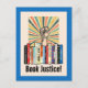 Protest banning books with this image that features a shelf of banned books, a protesting raised fist, a burst of colour rays and the words "Book Justice" in a retro font. Accented by a border of rich blue. Looks great!