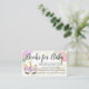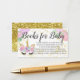 Pretty unicorn face with eyelashes and horn, and flat printed gold glitter effect (no real glitter), Book Request for Baby Shower Invitation insert card with beautiful girly theme, swirls and stars, and dark grey text. This cute little saying poem added to your baby shower invitation insert, suggests guests sign and bring books instead of cards for the baby shower gifts for the little girl one on the way.