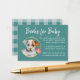 Cute book request insert for your gender neutral puppy themed baby shower. The text on top says "books for baby " in a modern font with explanation of how you'd like the guests to bring a book for your baby instead of a card. The back of the card is teal gingham. The dog is holding a lotus flower and it was painted with watercolor.