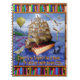 This beautiful, original fantasy spiral notebook is based around the Emily Dickinson poem that begins, "There is no Frigate like a Book To take us Lands away." The quote appears at the bottom, below a masted sailing ship made of an antique book. The words from the poem are scrawled throughout. They're torn-looking on the sails, they wrap around the balloon in the distance, and they decorate the wings of a dragonfly that has a pencil body. They even faintly appear on the faded rainbow. Meanwhile, book seagulls fly away while a killer whale and a purple squid surround the book ship. It's a pretty, surreal scene for any book lover, avid reader, writer, English teacher, librarian or bookstore owner. The top and bottom are bordered in a bookshelf pattern.