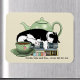 A cute black and white tuxedo cat sleeping on a pile of books with a green teapot in behind and a cup of tea in front.