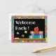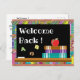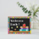 A cute postcard to welcome elementary school students back to school . On the front you can read the message "Welcome back!" on a faux chalkboard . You can also see some books and a red apple . On the back is the text template . Simply change the info regarding the date and time of the first day of school . There is also lines to add the teacher's name and room number .