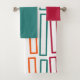This towel set has beet coloured washcloth, a turquoise hand towel, and a bath towel with a mid-century modern design of repeating rectangles in teal, orange, beet and orange on a field of white. If you like the design but prefer different colours, message me.