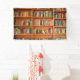 School library educational books on a brown wooden bookshelf for teachers, students and bookworms.