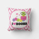 This adorable book pillow has pink and white chevron zigzag background with cute bookworm and I love books slogan.