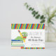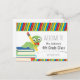This postcard features a bookworm holding a pencil and sitting on a stack of books. The background is a colourful diagonal stripe pattern with a white box in the centre. Customisable text allows you to add the teachers name, grade and school. The back of the postcard features customisable text for a personal message from the teacher.
