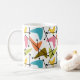 This mug has a mid-century modern design of boomerangs scattered about with segments crossing them.