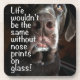 This square wall decal sports close up photograph of a chocolate Labrador Retriever nose with text ~ Life wouldn't be the same without nose prints on glass.