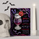 This Halloween Costumes and Cocktails invitation features hand drawn illustrations such as a black magic cocktail with a spooky skull and blood orange garnish with magical spooky swirls as a border with a colour palette of purple, black and red. Invite your guests to boos and booze this halloween. On the back of the invitation is a spooky swirl design with skulls, bats and spiders. You can customise all of the text on this invitation. See the whole matching collection.