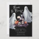 This spooky-fun invitation features a ghost, pumpkins, a spooky cocktail, and a skull. The words "Boos and Booze" are written in a script font. It's the perfect way to invite your friends to a Halloween party where they can come dressed up in their costumes and enjoy some boozy cocktails.