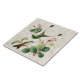 Ceramic tile design features vintage illustration of the Booted Racket-tail hummingbird (Steganura underwoodi, Ocreatus underwoodii.) Two green hummingbirds perch on the blossoming branch of a myrtle shrub, with a light gold marble background.