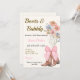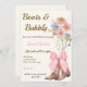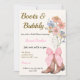 The Boots and Bubbly bridal shower invitation is designed with brown cowgirl boots, a pink bow, colourful flowers, pink, brown, and black text, and a tan background.