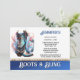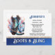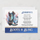 A beautiful fantasy brown tooled leather cowboy boot has pink and pale blue inlays that appear to glow, Soft fancy leaf tendrils in a pale red appear around it and the boot rests against a large blue and white faceted diamond. The bottom edge has a gradient blue horizontal band across it edged with a faux diamond and gold chain. Editable black templates appear against the white background. These are ideal for "boots and bling" and "boots and bubbly" country western them glam bridal showers.