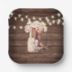 Lovely personalised rustic BOOTS and BUBBLY bridal shower disposal paper plates for that southern girl (Texas hold'em). Blush pink cream brown watercolor peonies flowers in cowboy / cowgirl boots and bubbly Champagne with flute glasses. Wood panels, brown barn colour with twinkling lights. Perfect invites for any rustic country / south (farm) shower party theme; summer, spring or any time of year. Easy editable template; colour, text, font can be changed. See matching items to coordinate your whole party!