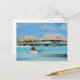Postcard of two men in an outrigger canoe bringing breakfast service Polynesian style to honeymoon guests in a luxury overwater resort on the tropical, pacific Island Bora Bora, French Polynesia with a fading bar and the text: 'Bora Bora'..