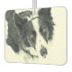 Car air freshener with photo of a snowy border collie. Photo on front and back.