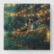 Set sail into the magic of the holiday season with this beautifully detailed illustration, showcasing a proud dog sitting in a festively decorated boat, gliding across a serene Christmas lake. The twinkling lights from nearby pine trees reflect off the water, casting a warm, festive glow that enhances the cosy ambiance. Ornaments dangle from the boat's sides, while glowing lanterns light the way, creating a scene that captures the true essence of Christmas warmth and joy. This nostalgic artwork brings a touch of holiday magic to any space, perfect for those who cherish the spirit of the season.
