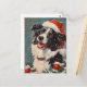 A heartwarming scene unfolds on the front of this festive Christmas card, featuring a charming Border Collie adorned with a jolly Santa hat. The furry friend gazes up with bright, soulful eyes, radiating the joy and anticipation of the holiday season. The Santa hat perched atop those intelligent ears adds an extra touch of merriment to this delightful canine Christmas tableau.