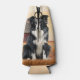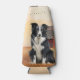 A beer or can cozy for poolside, a fun Father's Day gift for the dog dad, too. A Border Collie dog sitting in a field at the ranch with a red barn and birds in flight in the background for a great country western cowboy theme.