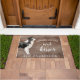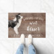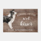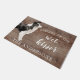 Funny beware of the wet kisser" Border Collie Dog door mat set on a rustic faux background. Visit our shop to view a large assortment of dog breads