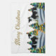 Border Collie in Winter Snow Forest Christmas Tree kitchen towel. Calm winter snow landscape with 2 lovely black and white border collies and colorful Christmas trees.