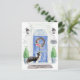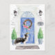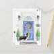 Announce your new address with our stylish announcement featuring a Border Collie, blue front door, welcome mat, slate sign, topiaries and a floral wreath set on a grey brick background.