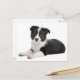 This fun canine postcard features a portrait of a baby black and white Border Collie puppy dog resting on a crisp white background. The back of the postcard is blank for your message.
