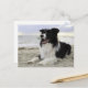 This fun canine postcard features a portrait of a happy black and white Border Collie puppy dog resting on the beach with a blue sky background. The back of the card is blank for your message.