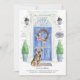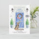 Announce your new address with our stylish announcement featuring a Border Terrier, blue front door, welcome mat, slate sign, topiaries and a floral wreath set on a grey brick background.