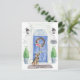Announce your new address with our stylish announcement featuring a Border Terrier, blue front door, welcome mat, slate sign, topiaries and a floral wreath set on a grey brick background.