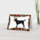 Fun Border Terrier Christmas Card has a dog breed silhouette, with reindeer antlers and a bright red glowing nose. The background is a cheery holiday plaid with reds and greens. The inside reads, "Wishing you and your family a wonderful holiday season!" Personalise the message to your own easily. Cute dog lover Christmas cards.