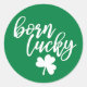 The inspirational phrase "Born Lucky" displayed in a white script typeface with a white hand-drawn shamrock over a green background.