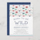 Adorable baby shower invitations for your wild one on the way feature a border of colourful feathered arrows in navy, teal and red. "Born to be wild" appears in navy blue lettering, with your baby shower details beneath.
