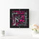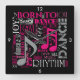 Is dancing your passion? This cool wall clock with a word cloud design says it all. Some of the words, interspersed with musical notes, are: breathe, live, love, dance, rhythm and born to dance. This version features shades of pink, grey and white on the background color of your choice. Search ID277 to see additional color options and matching products with this design.