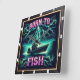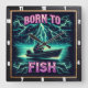 This artwork showcases a fearless fisherman in a boat, braving a dramatic and beautifully coloured storm on a lake. The bold graphic style and striking colour scheme of purples, teals, and pinks make the scene pop with energy. The design is an ode to the dedication of anglers everywhere. The phrase "BORN TO FISH" is written in a stylised pink. The entire scene is framed by glowing, decorative fish and foliage, giving the artwork a powerful and energetic feel.