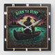 A powerful illustration of a hunter on a lake under the cover of a dark, tooled, neon-coloured sky. He is in a small boat, surrounded by several ducks. The mountains and a lone bird overhead add to the overall atmosphere of a solitary and determined pursuit. The phrase "BORN TO HUNT" is prominently displayed at the top of the artwork.
