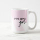 Featuring the empowering phrase "You Go Girl" in a modern style typography, the mug blends classic serif with playful hand lettering, creating a design that's both stylish and uplifting. The dynamic shapes in pink and white add a chic and vibrant touch, making it a perfect addition to your office bureau or home workspace.
