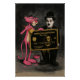 Playful pop-art mashup: a pink cartoon panther paints while a vintage, silent-era gentleman in a bowler hat holds an oversized black-and-gold “boss edition” card. Dripping details, grayscale shading, and hot-pink splashes give it street-art attitude and tongue-in-cheek luxury vibes—a bold, humorous statement piece.