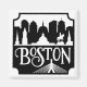 This fresh black-and-white illustration of the Boston skyline features many familiar landmarks, including the capitol building, the custom house tower, the Hancock, Old Hancock, and Prudential buildings, as well as the Zakim bridge and financial district.