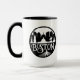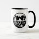 This fresh black-and-white illustration of the Boston skyline features many familiar landmarks, including the capitol building, the custom house tower, the Hancock, Old Hancock, and Prudential buildings, as well as the Zakim bridge and financial district.