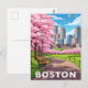 A picturesque park scene with blooming cherry trees framing a view of the Boston skyline under a bright blue sky with fluffy clouds.